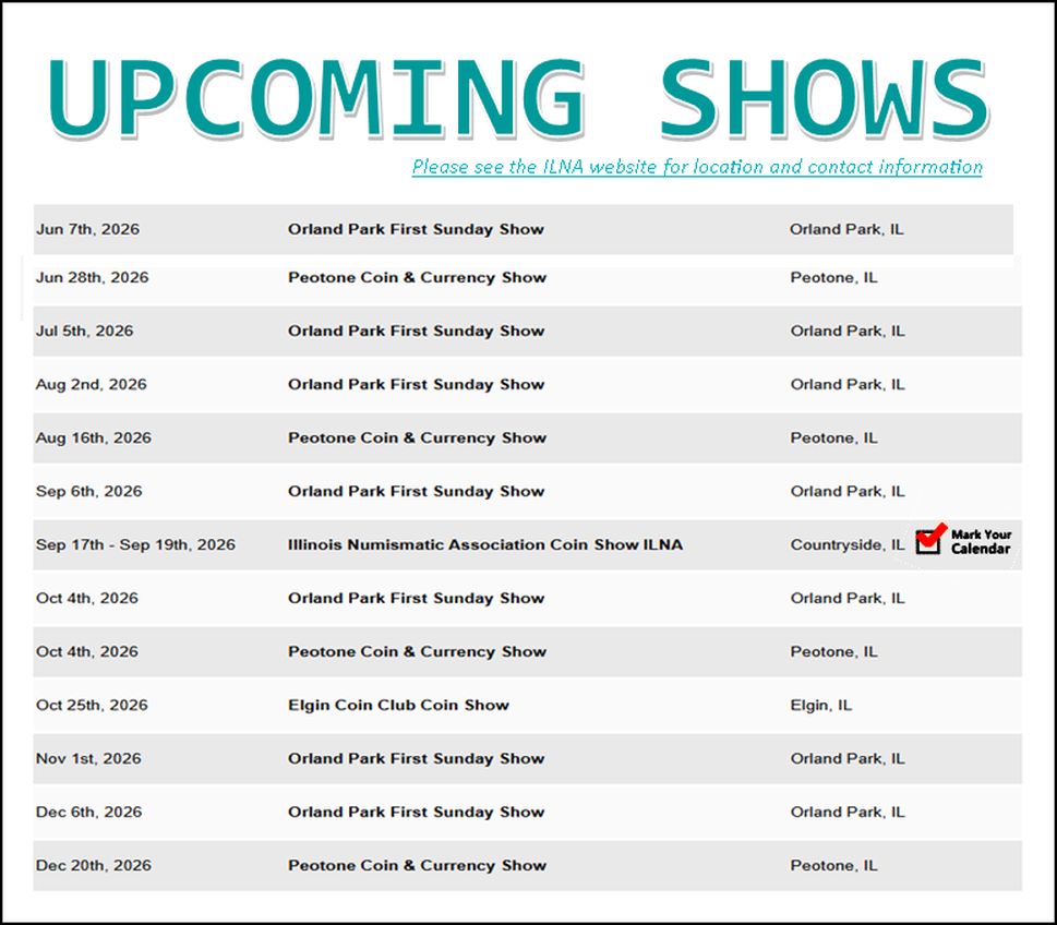Below is a list of coin Shows in Illinois. The list is not comprehensive and depends on submissions by ILNA Members,Member Clubs, and Other interested parties. To be included or make corrections email the ILNA Webmaster or contact the ILNA Secretary at ILNA Secretary.